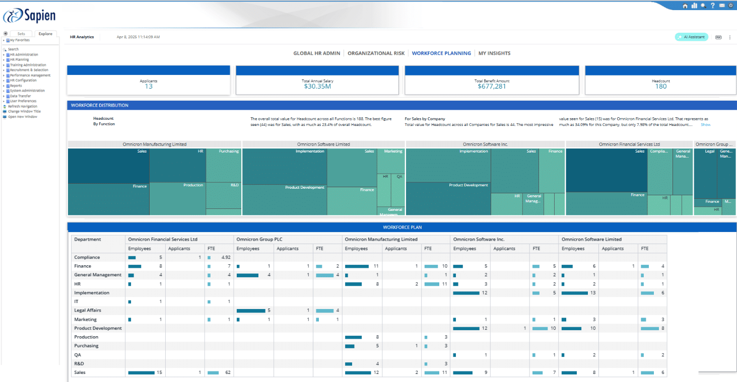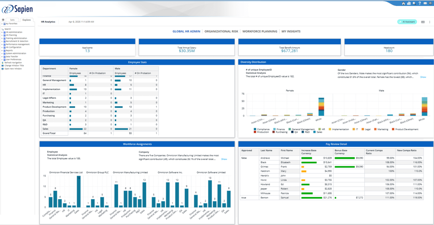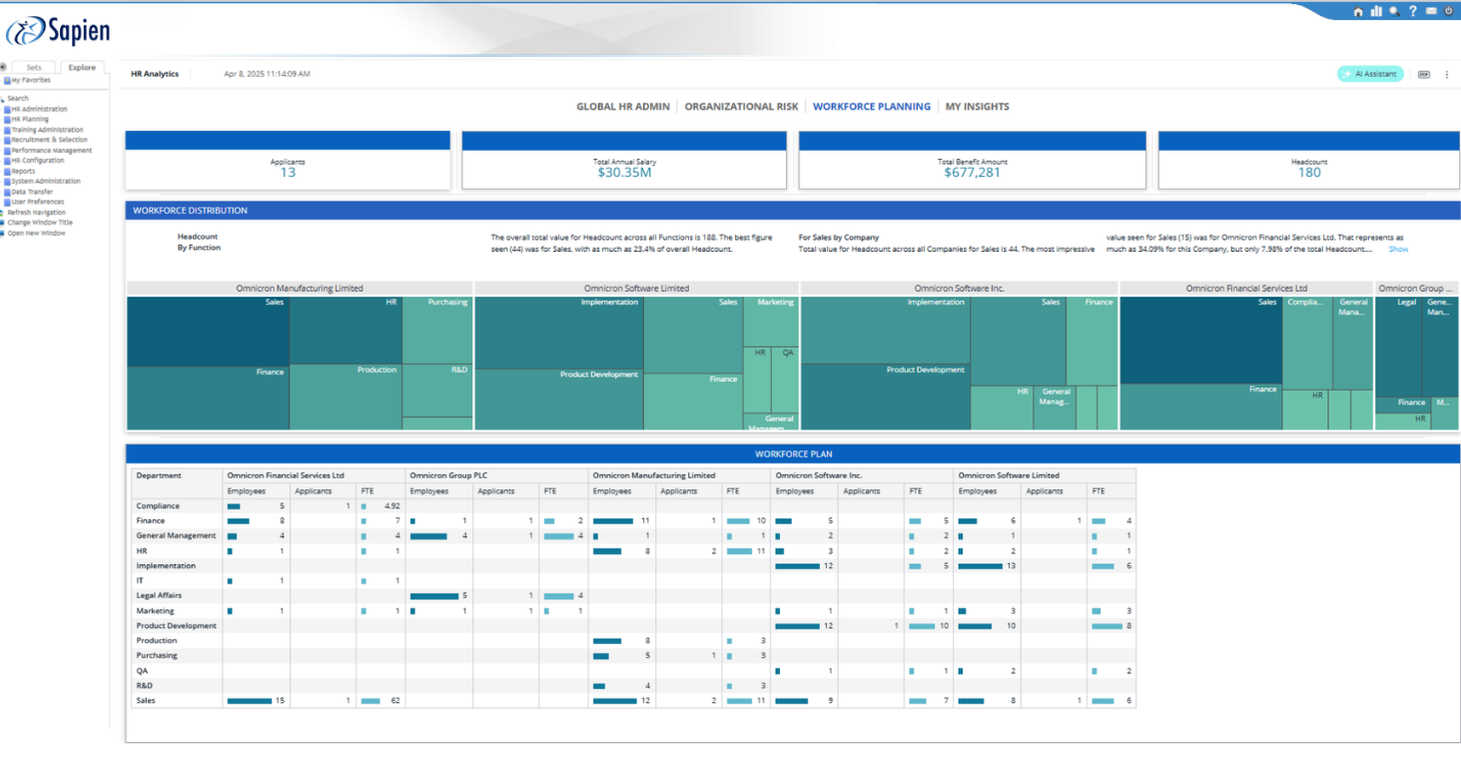 A deeper dive into the employee base, Sapien enables companies to view details ranging from gender and diversity to organizational structure, salaries, and more. Whatever data exists in the system can be presented with an eye towards better understanding of the strengths and vulnerabilities of the organization.