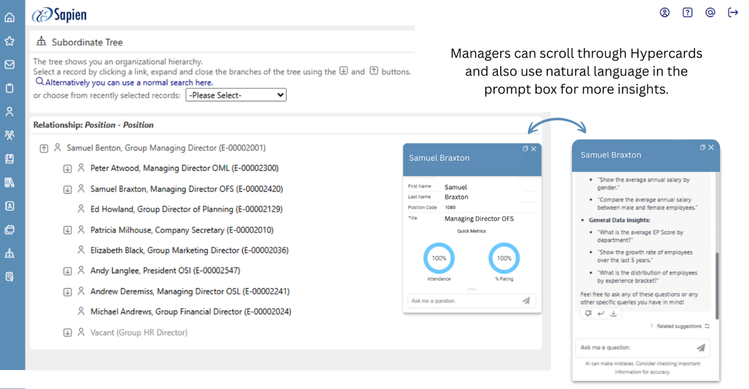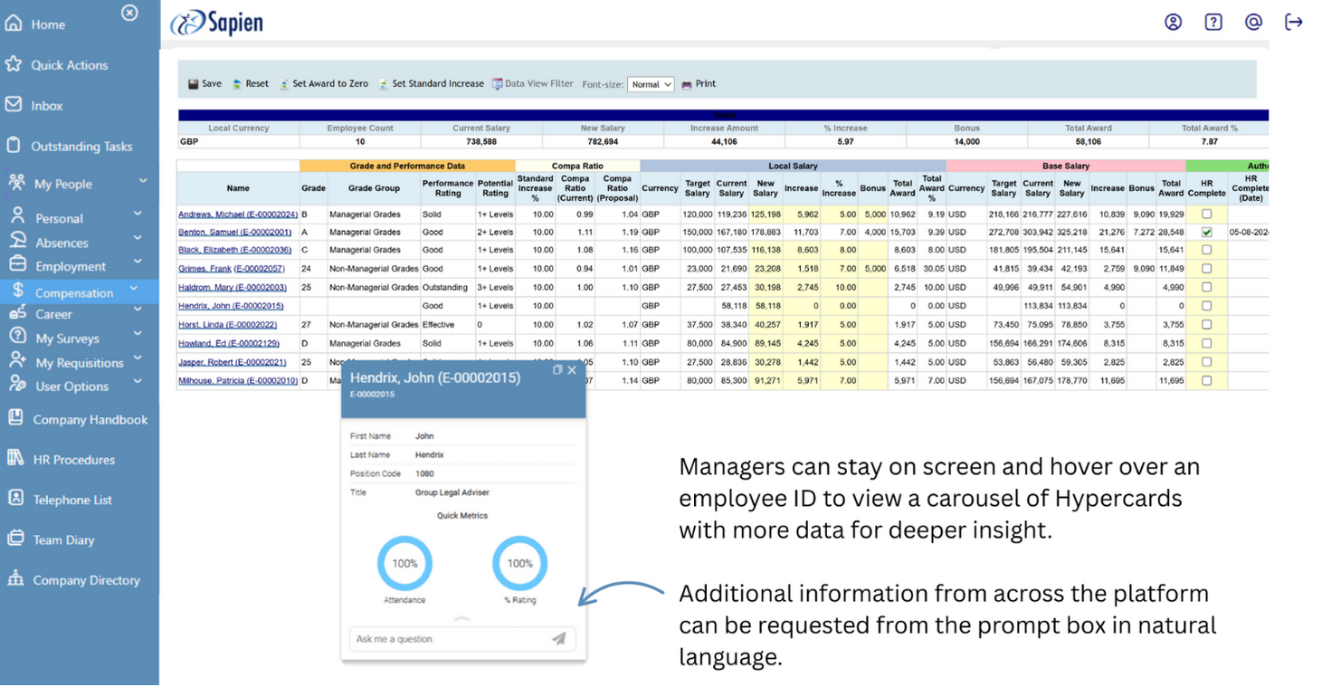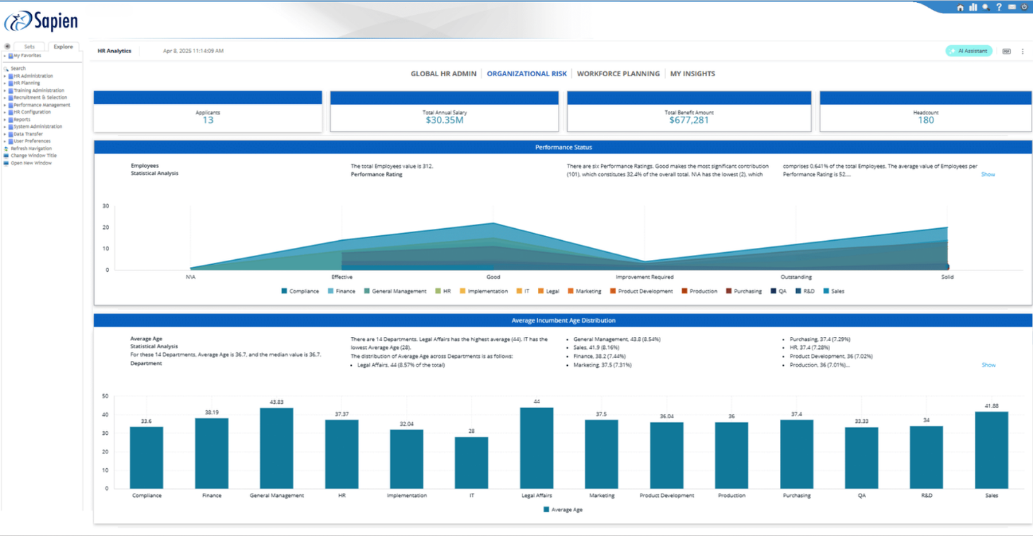 A deeper dive into the employee base, Sapien enables companies to view details ranging from gender and diversity to organizational structure, salaries, and more. Whatever data exists in the system can be presented with an eye towards better understanding of the strengths and vulnerabilities of the organization.