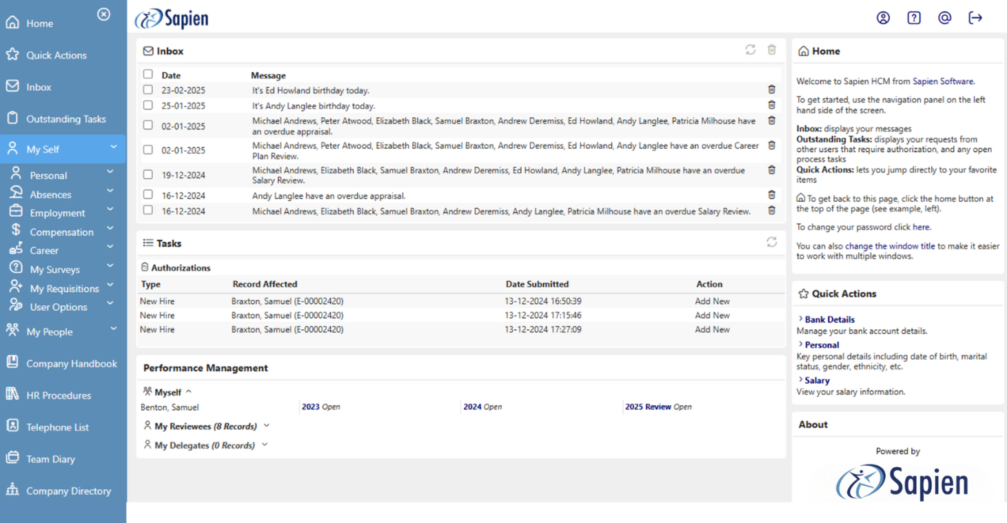 HOME SCREEN: Administrator (Local/Regional/Global) access to employee data objects and system administration capabilities (based on security roles and access) including Reporting, Interface Management and global system settings. Snapshot to Messages, Open Items, and Outstanding Tasks.