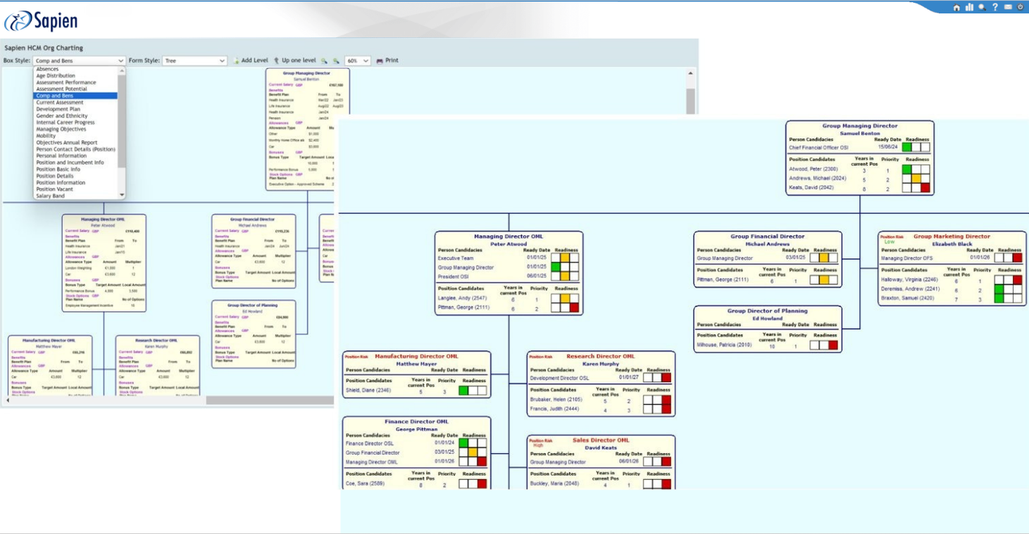 25+ box styles, can be customized with compensation, benefits, performance ratings, etc. Enables position/entity control functionality as well as ability to create ‘what if’ scenarios.