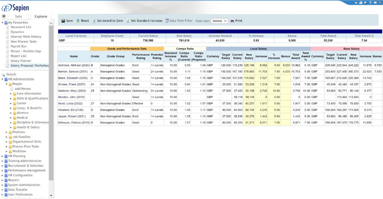 Customizable Worksheet for base, merit, focal, anniversary, etc. based on custom pay groups, with global currencies and conversions. Ability to aggregate in core corporate currency and disseminate in local currency.